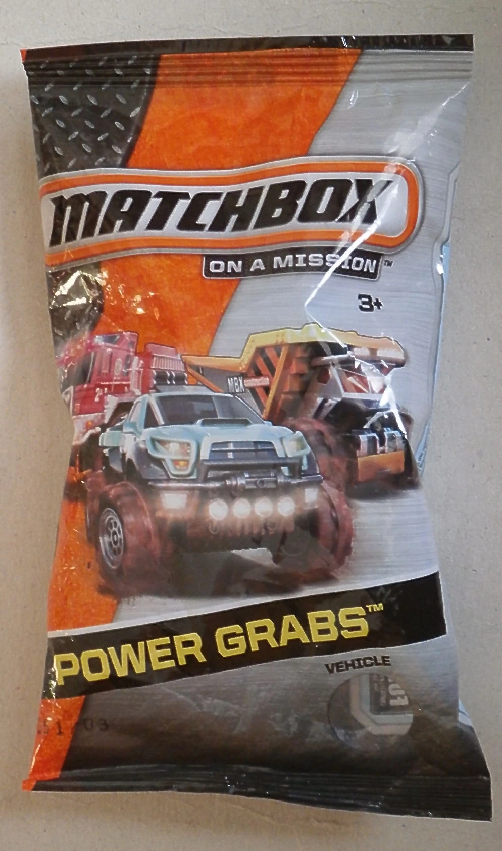 The Matchbox Power Grabs was a Mystery Special Series released in 2015, featuring 11 models from the mainline in a small plastic bag with a visible hole inside to see the model. It was sold at select retailers in the US and overseas.