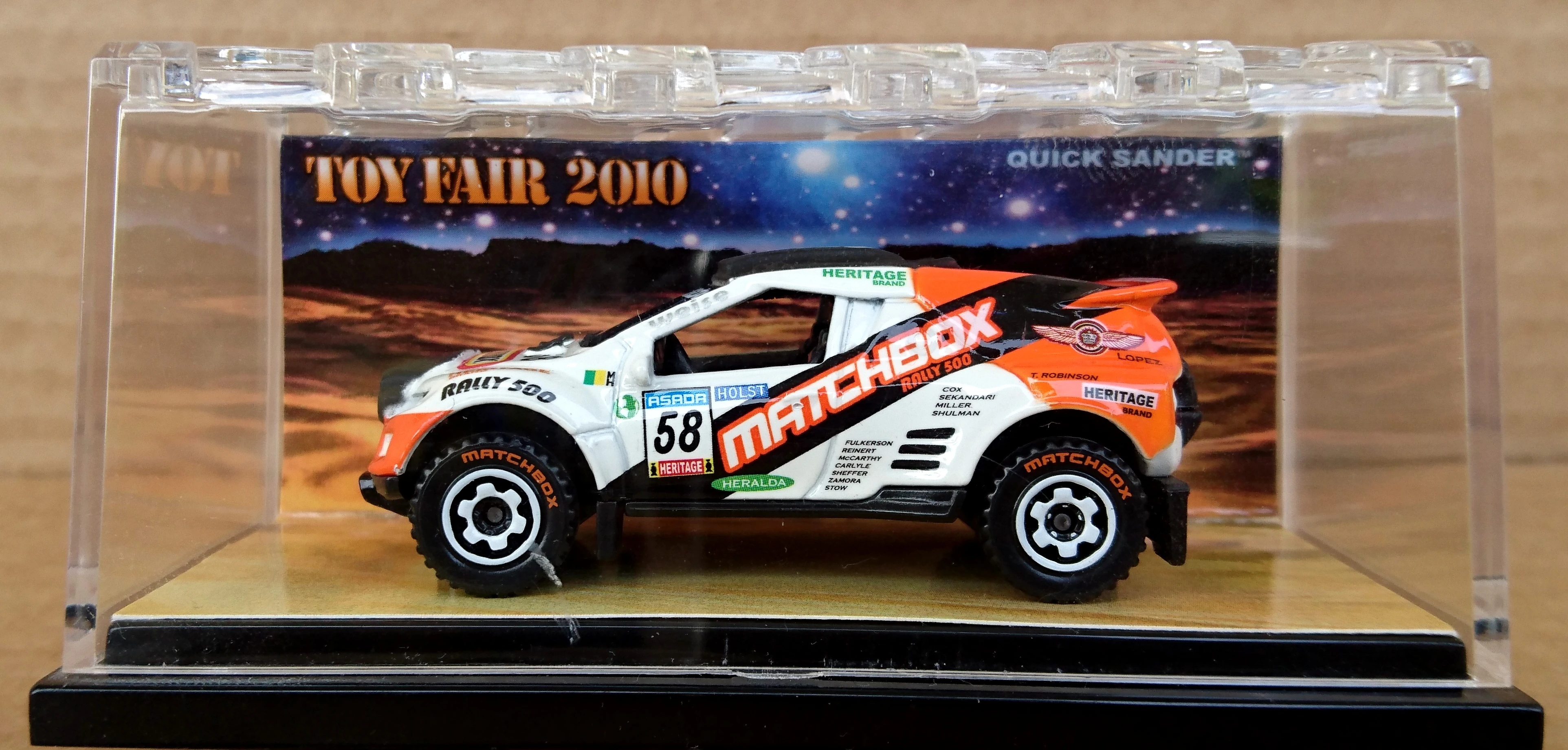 | N/A | 2010 | Promotional Toy Fair | White | Matchbox, 58, logos, 2010 Toy Fair, very detailed trim | Black / Plastic | Smoke | Black |