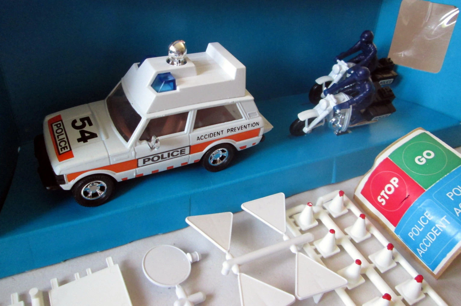 Super Kings | White | Red stripe, POLICE, 54, ACCIDENT PREVENTION | Black / Plastic | Clear | Red | England | Includes Range Rover, 2 x Honda 750s, road signs & bollards |