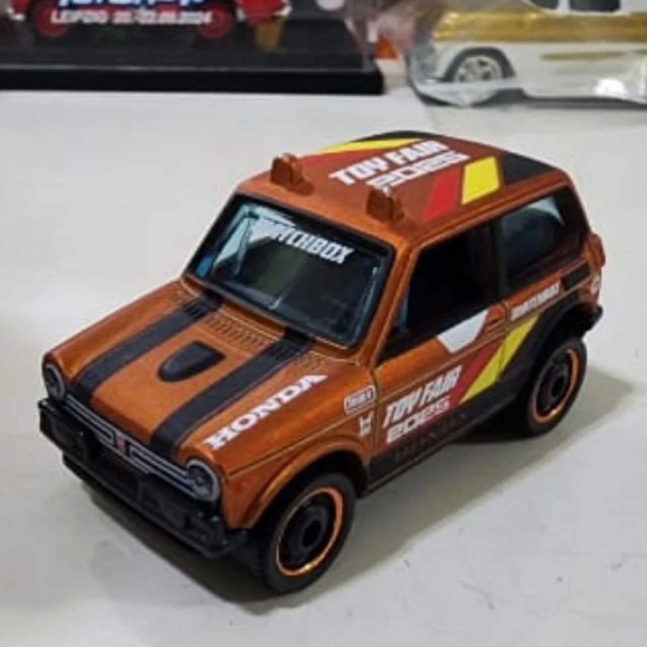 | MB1347 | 1970 Honda N600 Off-road | 2025 | Toy Fair Exclusive | Metallic Copper | Detailed Trim; Red, Black and Yellow Stripings. Toy Fair 2025, Honda, Matchbox Logos | Black / Plastic | Blue Tint | Black | Black disc and Bronze lip |