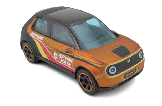 | MB1227 | 2020 Honda E | 2022 | Toy Fair Exclusive | Metallic Copper | Detailed Trim; Red, Black and Yellow Stripings. Toy Fair 2022, Matchbox Logos | Black | Blue Tint | Black | Thailand |