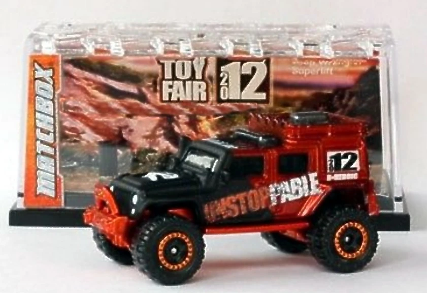 | MB832 | Jeep Wrangler Superlift | 2012 | Toy Fair Exclusive | Matte black and Copper chrome | UNSTOPPABLE 12, MATCHBOX | Orange | Smoke | Black |