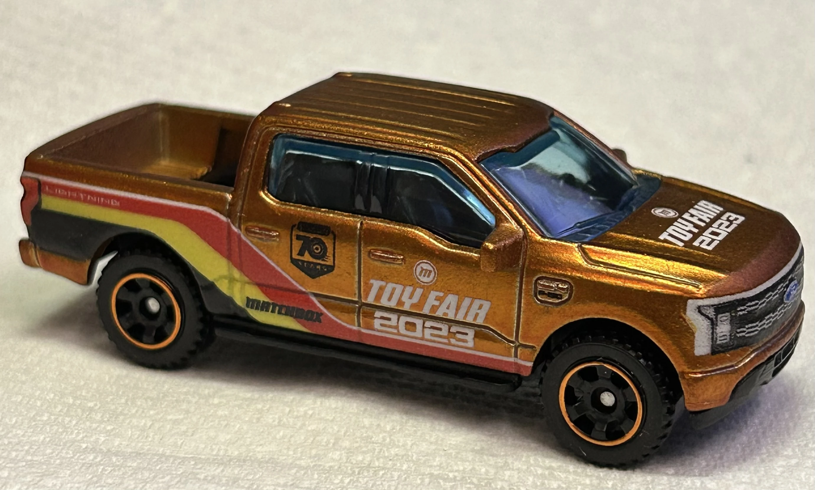 | MB1295 | 2022 Ford F-150 Lightning | 2023 | Toy Fair Exclusive | Metallic Copper | Detailed Trim; Red, Black and Yellow Stripings. Toy Fair 2023, Black 70 Year Anniversary Logo | Black | Blue Tint | Black |